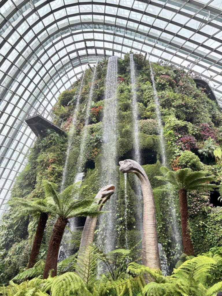 そして、スーパーツリーのほかに特におすすめなのは「クラウドフォレスト」。入ってすぐ美しい滝と生い茂る緑に心が魅了されました。どこの緑を切り取ってもとても綺麗で、どこを歩いていても深呼吸したくなります。そして、ジュラシックパークとのコラボにより、あたりに恐竜がたくさん生息しています。圧巻なのはティラノサウルス。動いているので、本当に逃げようかと思うほどの迫力です。