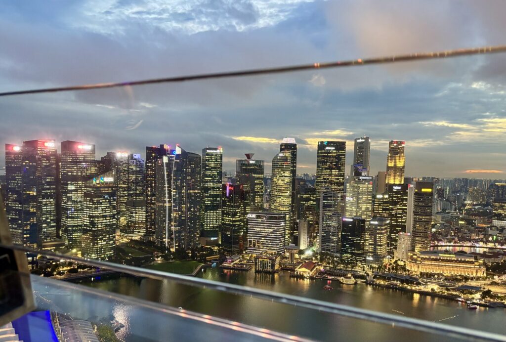 こちらがスカイパークから見た景色です!スカイパークは屋外で悠々とシンガポールの絶景を楽しめる展望台です。ちょうど夜景が見え始めるのは19時半ごろと少し遅め。しかし、チケットは早めにとっておきましょう。17時半に行った時点で最終時間帯のチケットしか残っていませんでした。