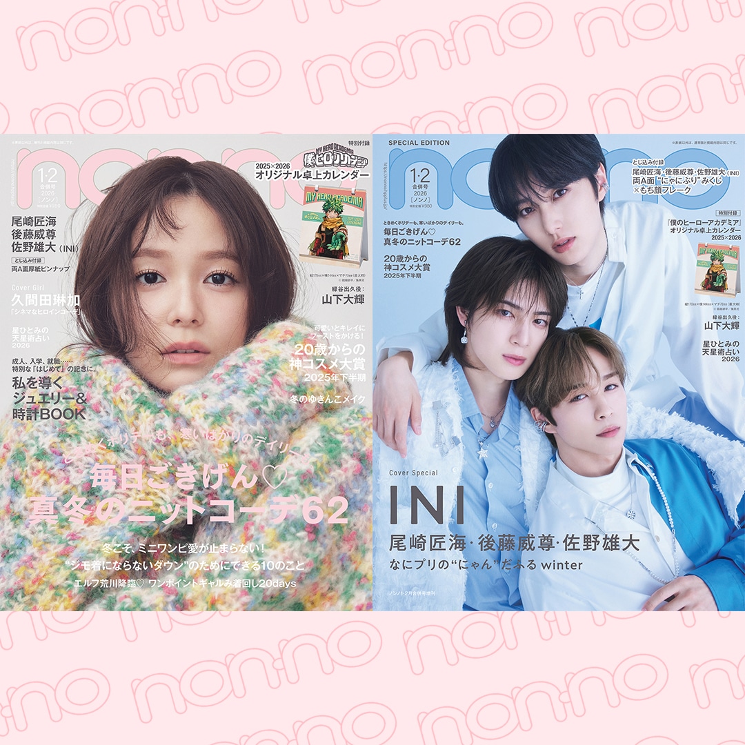 久間田琳加、INI尾崎匠海&後藤威尊&佐野雄大がノンノ1・2月合併号表紙に。特別付録はヒロアカ卓上カレンダー