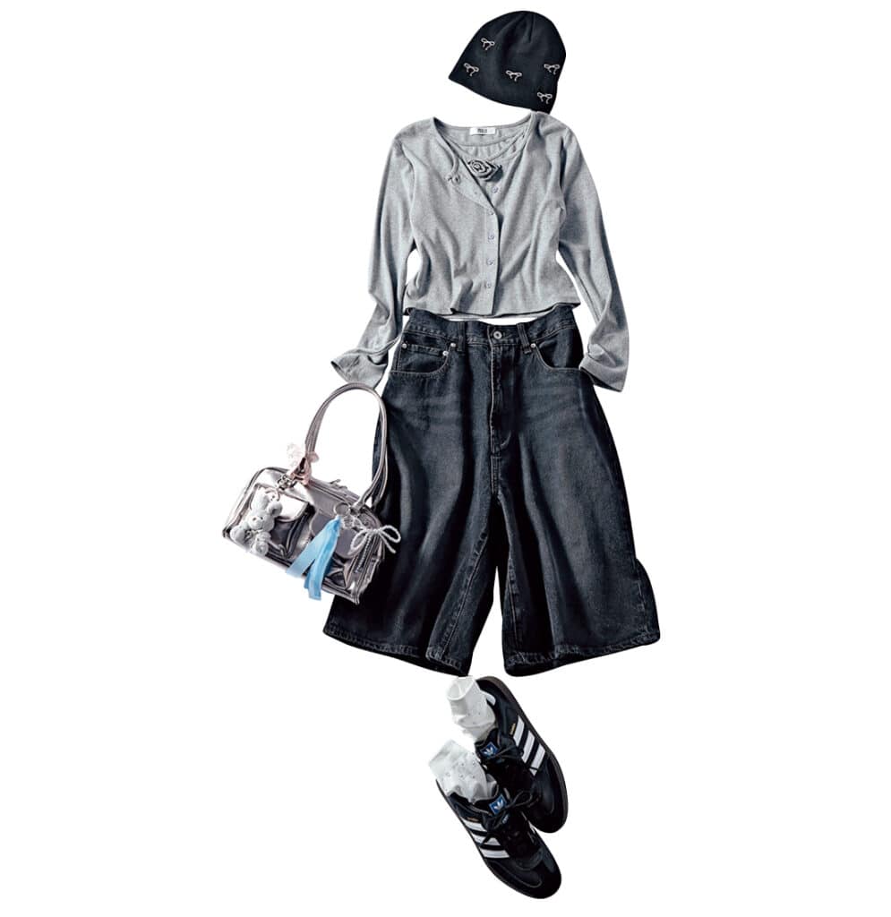 パンツ/上と同じ トップス¥3959/フィリー 帽子¥2290/アダストリア(エーランド(3.3フィールド トリップ)) バッグ¥3289・チャーム(リボン)¥770・チャーム(イルカ)¥1100/SPINNS バッグにつけたヘアクリップ¥770・チャーム(ウサギ)¥550/WEGO 靴下¥1760/Tabio(靴下屋) 靴¥15400/アディダスお客様窓口(アディダス)