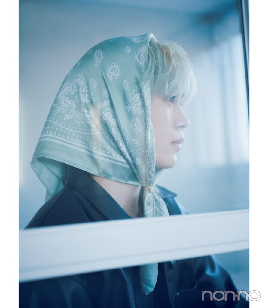 頭にスカーフを巻くスタイルは、JO1の楽曲『ICY』の振り付けを担当してくださった先生がやっていたのを見て挑戦! アゴ下で結んでもいいけど、ファッションリングで留めて、ちょっとこなれた雰囲気に仕上げるのが今の気分です。