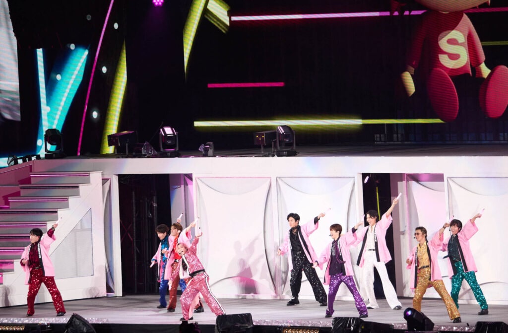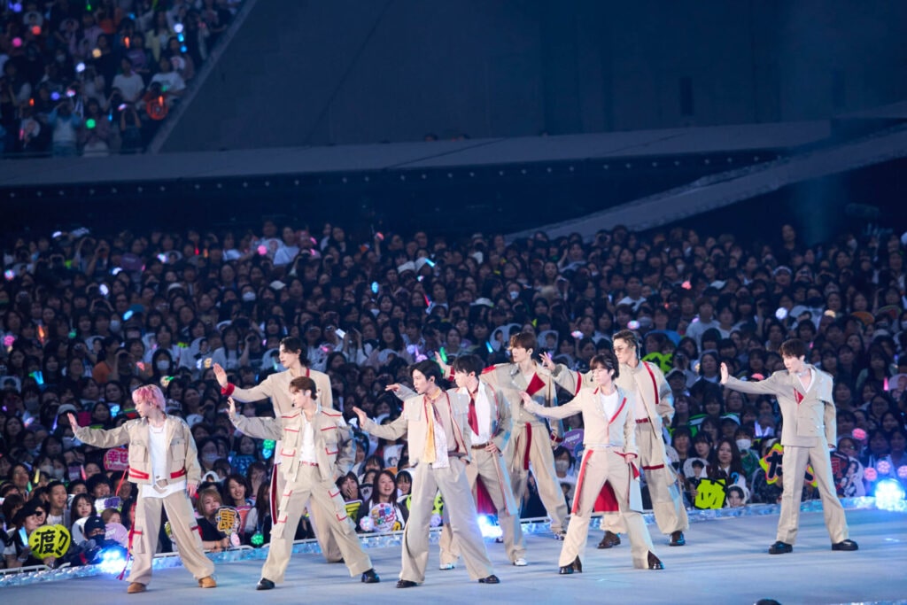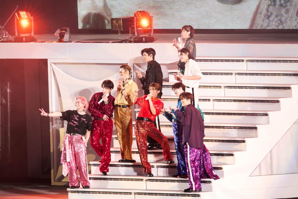 そして、目黒さんの「次の曲は、ファンのみなさんに伝えたい言葉を並べた曲で、僕たちのそういった想いがみなさんに歌を通して届けばいいなというふうに思います」という曲紹介で始まった『Dear,』。ゴンドラに乗ってステージ上方へと上がった9人は、歌詞に自分たちの想いを重ねて感謝の気持ちを届けていきます。その目には、キラリと光るものが……。歌い終えると、それぞれが「端から端まで本当にありがとう!」、「会いにきてくれてありがとう!」、「上のほうもありがとうね!」と想いを伝えていくなか、目黒さんの「マジで奇跡だな」というつぶやきにラウールさんが「国立だよ~、奇跡だよ~」と答え、メンバーが夢のステージに立てたよろこびを噛みしめている姿が印象的でした。