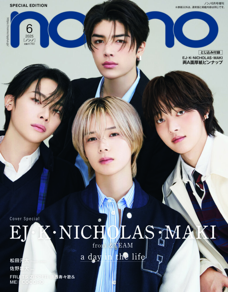 発売中のノンノ6月号増刊では、メンバーのEJさん、Kさん、NICHOLASさん、MAKIさんの4人が表紙を飾っています。4人のペア総当たりでの撮影&インタビューでは、それぞれの関係性を深掘り。今回出演しなかった5人のメンバーのTMIや「Go in Blind(月狼)」についての話も必見です。とじ込み付録の両A面厚紙ピンナップや、誌面の応募券による4人それぞれのサイン入り写真プレゼントもお見逃しなく!