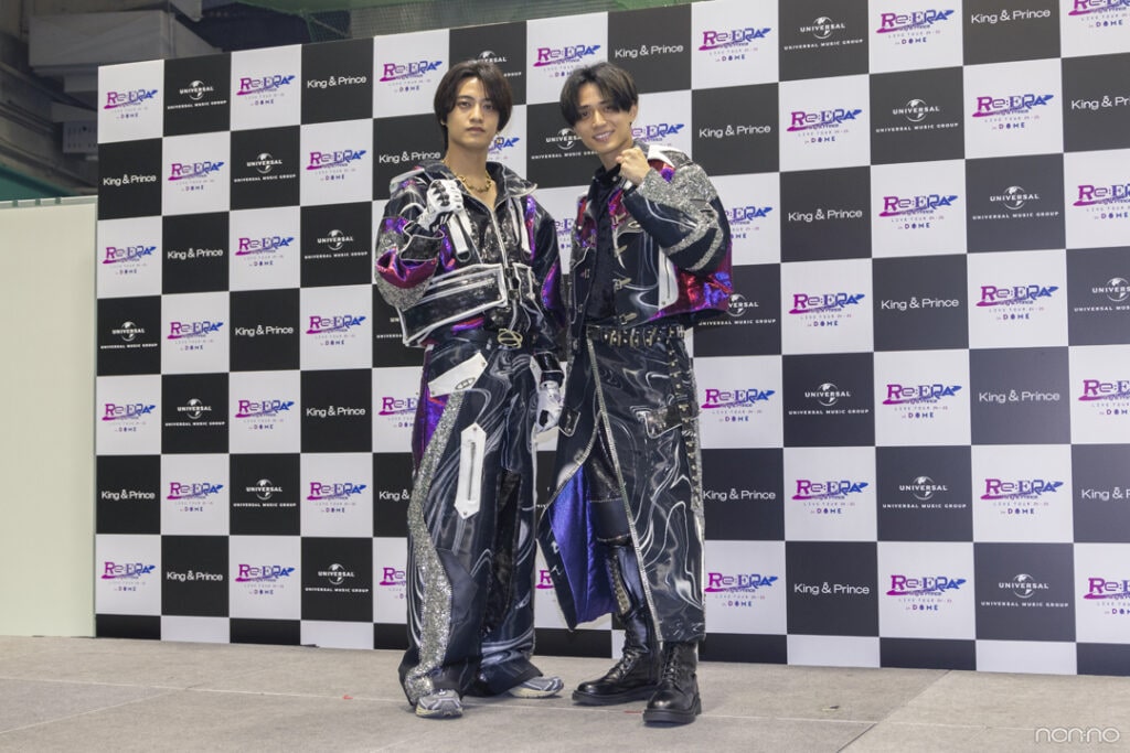 司会者から「King & Princeのお二人です! どうぞ!」と紹介され、宇宙服をモチーフとした衣装で会見場に姿を現した永瀬廉さんと髙橋海人さん。早速、永瀬さんからは「今日は二人になって初めてのドーム公演にお越しいただき、ありがとうございます。とても暑いですよね、最近……。すみません、本当に。あの、全然、水飲んでください。短い間ですが、よろしくお願いします!」、髙橋さんからは「今日はたくさんの方にお集まりいただき、うれしく思っています。短い間ですけど、ちょっとでも楽しくできたらなと思うので、よろしくお願いします!」と、二人の温かい人柄が伝わってくる挨拶がありました。