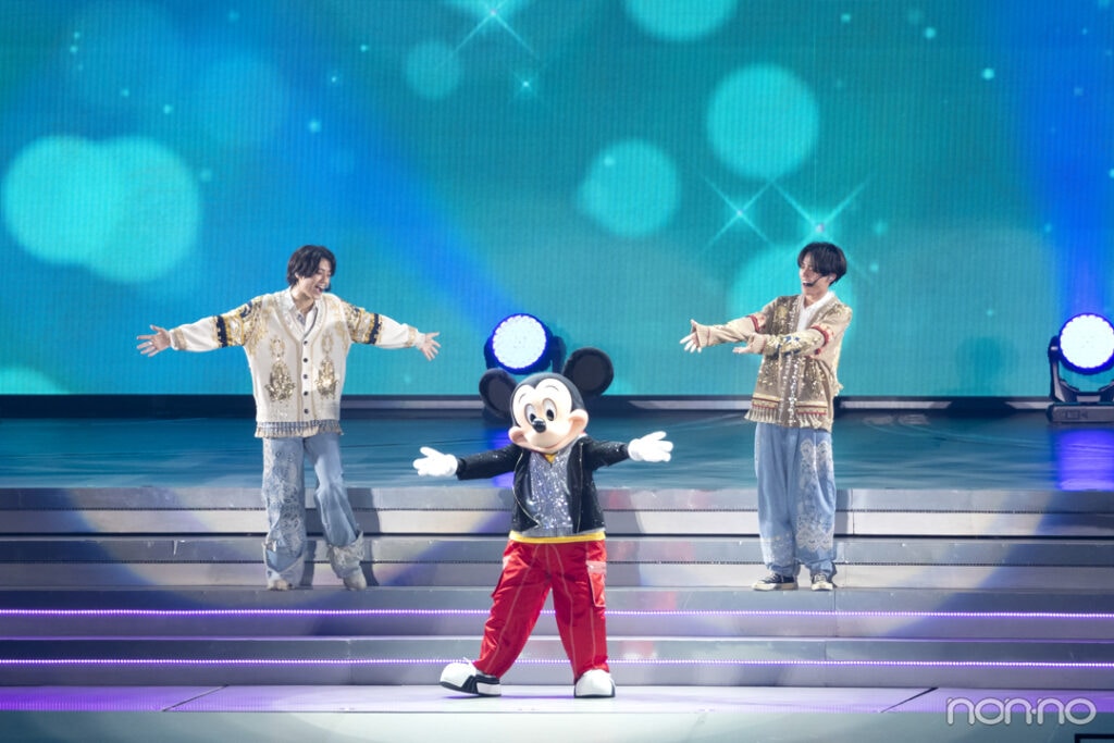 セットリスト後半の1曲目は、ミッキーマウスの新オフィシャルテーマソング『What We Got ~奇跡はきみと~』。ここで、歌い始めた永瀬さんと髙橋さんの間に二人のベストフレンドであるミッキーマウスが登場するというサプライズが! 3人で花道を歩きながら客席に手を振り、サビでダンスを踊ると、東京ドームはこの日一番の歓声に包まれました。キュートなパフォーマンスを終えた髙橋さんは感激のあまりミッキーとハグ、永瀬さんは「前回の福岡のコンサートの時は電話をくれてすごいうれしかったけど、今日はなんと来てくれていました! これ以上うれしいことはない! ミッキーありがとう!!」と笑顔に。ミッキーとバイバイしたあとは、永瀬さんが「頑張ってきてよかったな」とつぶやき、髙橋さんと握手からのハグをする場面もありました。8月1日からはKing & Princeとミッキー&フレンズがコラボレーションした特別番組『King & Prince: What We Got ~奇跡はきみと~』が、ディズニープラスで世界同時配信されるので、要チェックです!