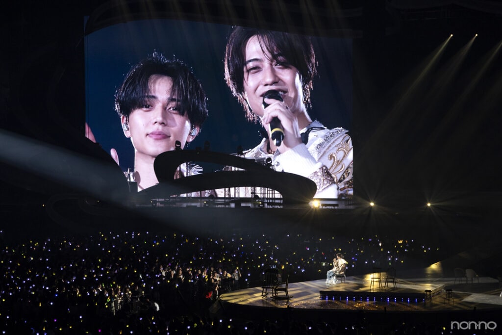 ミッキーマウスとドームのステージで共演するという夢を叶えた二人は、いろいろな椅子が置かれたセンターステージへと移動。そして披露されたのは、まっすぐな歌詞が胸に響く『話をしようよ』。永瀬さんはロッキングチェアに揺られながら歌い(間奏で髙橋さんから「揺れすぎじゃね?」のツッコミも)、やがて次々と違う椅子に座っていきます。髙橋さんが隣に座りにくるたびに、わざと別の椅子に移動する永瀬さん。途中から髙橋さんはどこにも行かないようにと永瀬さんの肩を抱え、最後は永瀬さんに「座ってみ?」とひとつの椅子を指差します。そこに永瀬さんが座ると、「こういうことやろ?」と、そのヒザの上に座るというイチャイチャぶりを見せつけてくれました♡
