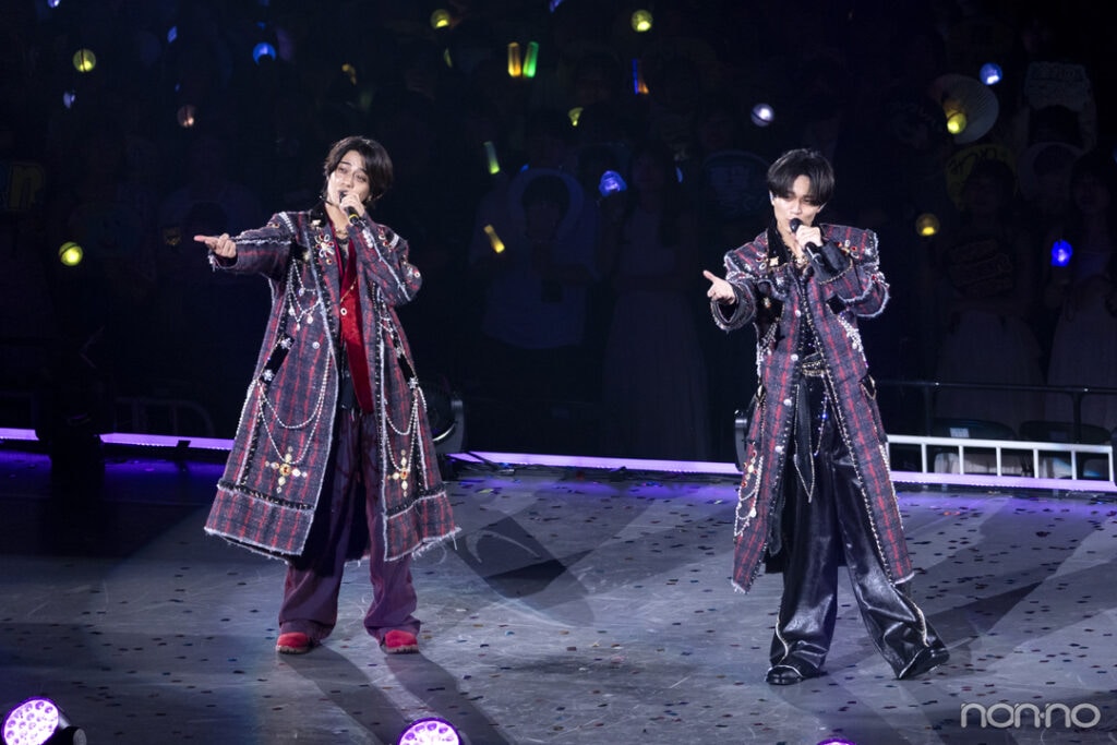 開演前の会場に一歩足を踏み入れた瞬間、ステージ上の照明が無数の星のように煌めく光景に目を奪われ、一気に『Re:ERA』の世界へと引き込まれていきます。オープニング映像の中で宇宙に向けて飛び立った永瀬さんと髙橋さんは、1曲目の『LOVE HACKER』が始まると同時にセンターステージに降臨。レーザー光線が交差し、スモークが立ち込めるその空間は、まさに宇宙の惑星そのものです。つづく『WOW』では、髙橋さんの「さぁ! みんな手上げて! いくぞ!」というあおりを合図にペンライトの光が上下に揺れ、ますます宇宙旅行をしているかのような気分に。髙橋さんが「廉となら優勝でしょ!」と歌詞を替えて歌えば、永瀬さんもすかさず自身のパートのあとに「か・い・と♪」とつけ足し、二人の息もピッタリでした!