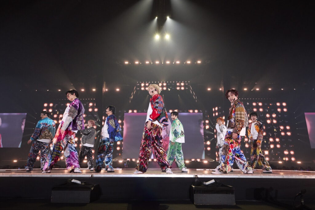 『Re-Booster』ではオリジナルメンバーである“一桁”の5人が激しいラップを掛け合い、タクヤさんが見事なアクロバットで見せ、クラップでどんどん会場を巻き込んでいくと、中盤ではセンターステージに新メンバーの“二桁”の4人が登場。たたみかけるラップの後にシューヤさんが伸びやかな歌声を聴かせると、全員が合流し、パワフルに、そしてセクシーに魅了。よりマサヒロさんのセクシーさが印象的です。さらに怪しげな空気感で『Kura☆Kura』がスタートし、全員の手を使った千手観音のような圧巻のダンスで惹きつけたかと思えば、『What’s up!』ではビジョンにポップなフォントで歌詞が映し出され、応援団のような振り付けでキュートにパフォーマンス。これぞ超特急のハッピーなオーラで会場を包み込み、みんなの笑顔がさらに伝染していきます。サウンドに合わせて、ひと言ずつ自己紹介をするメンバーたちも、とっても楽しそう!