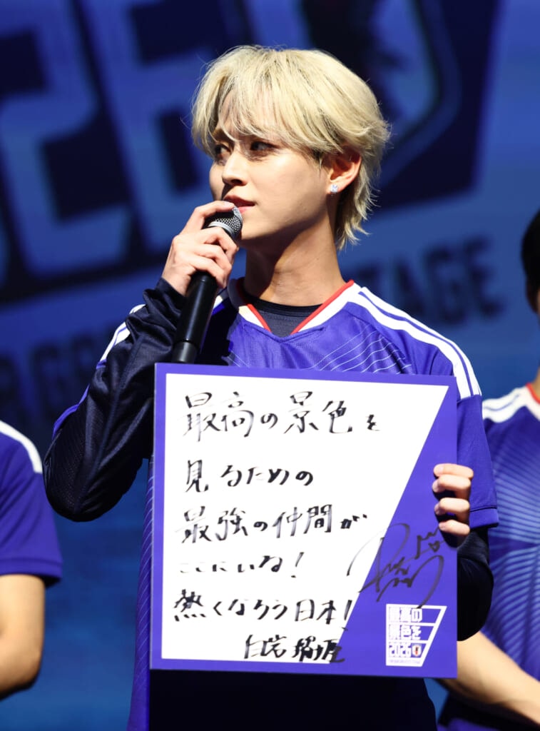 ということで、意味はですね、僕たちもオーディション番組でたくさんの人に投票していただいたり、応援していただいてデビューさせていただいたグループということで、本当にそういう方たちの支えとか、力というのに何度も救われてきて、今があると思っていて。サッカー日本代表の皆さんにとって僕たちもそういう応援というか、支えができるようなグループになっていけたらと思いますし、日ごろから応援してくださっているサポーターの皆様と力を合わせて、世界一に向かって頂を目指してがんばっていきたいですね。そしてこれからはもっと、サッカーの日本代表を熱くしようというメッセージで、これを書かせていただきました。