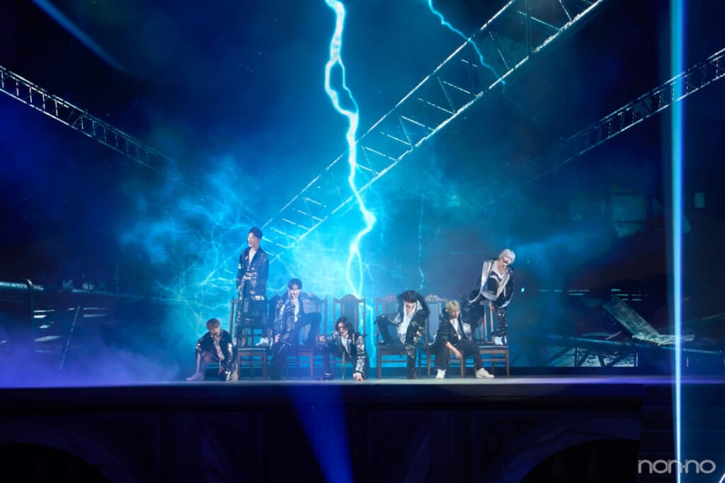 橋本さんが「会場のみなさん! 複雑なこと考えないで音楽楽しんでいこうぜ! 幸せになろうぜ!」と叫び、オリジナル曲『First Beat』を投下。炎が降り注ぐステージで全員がものすごい気合いで叫ぶようなステージには熱い想いがしっかりと乗っていて、胸が熱くなった人も多いはず。彼らの想いがひしひしと伝わってくるロックチューンで横浜アリーナを刺激した後、川﨑さんが叩くドラムの音が身体中に鳴り響いていきます。川﨑さんはまだドラムを初めて歴が浅いとは思えないほどのテクニック。そこに矢花さんのベースが重なり、このグループの強みのひとつである稲葉さんのヴァイオリンの美しい旋律から始まったのは『Truth』。緊張感あふれる、重圧感のあるサウンドの中に、それぞれ色の違う歌声が重なったあと、橋本さんは「いっぱいかわいくしてきたんでしょ? イケメン見れて嬉しいかい?」声をかけると会場は大盛り上がり! クールに決めたかと思えば、「僕たちはロックなことをやっていますが、STARTO ENTERTAINMENTのジュニアです!」と言い、とってもキュートな『なつ♡あい』を披露。クルクルと変わる表情で楽しませていると、関西ジュニア代表の8人が途中から参加し、一緒に仲良く絡み合い、バトンタッチ!