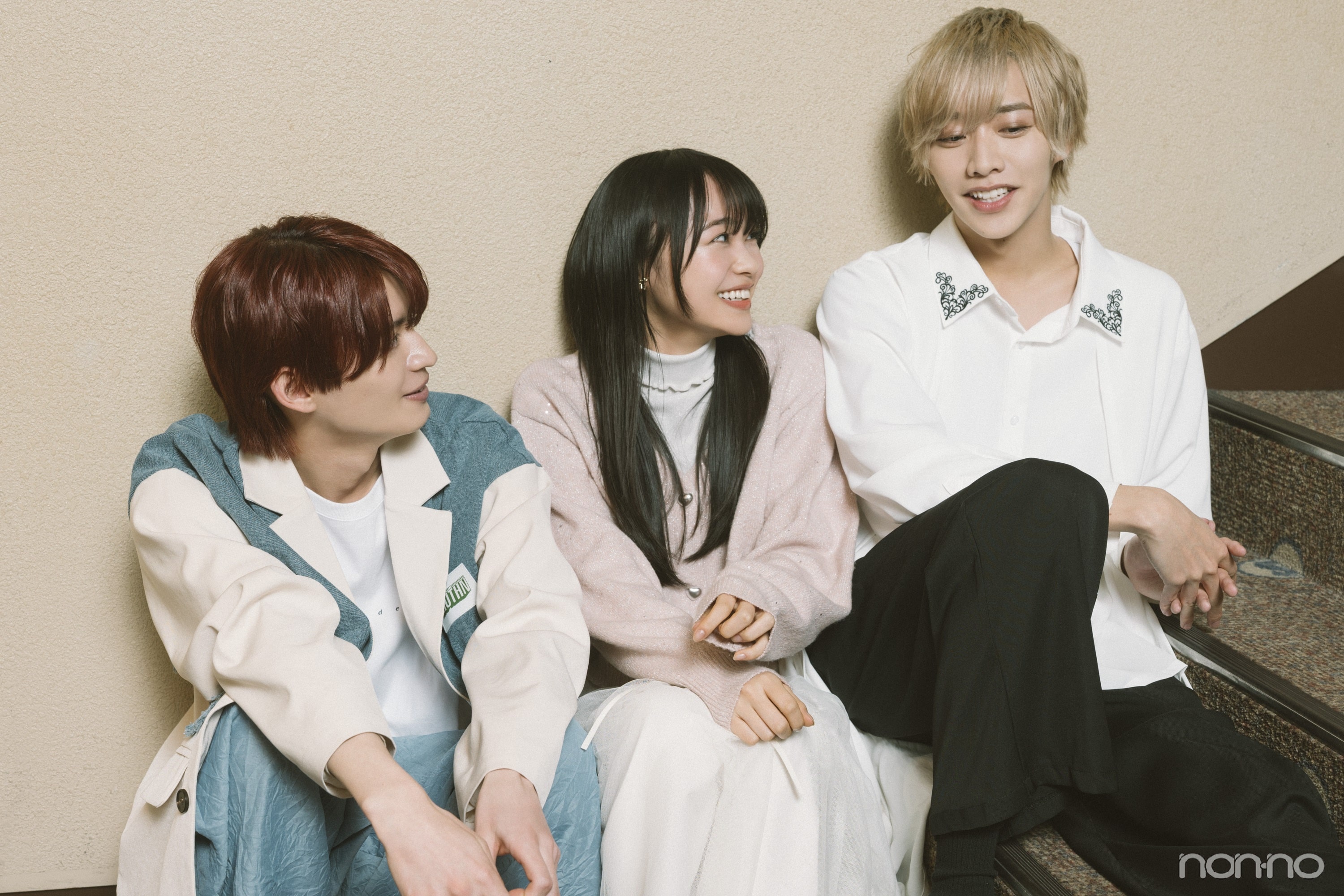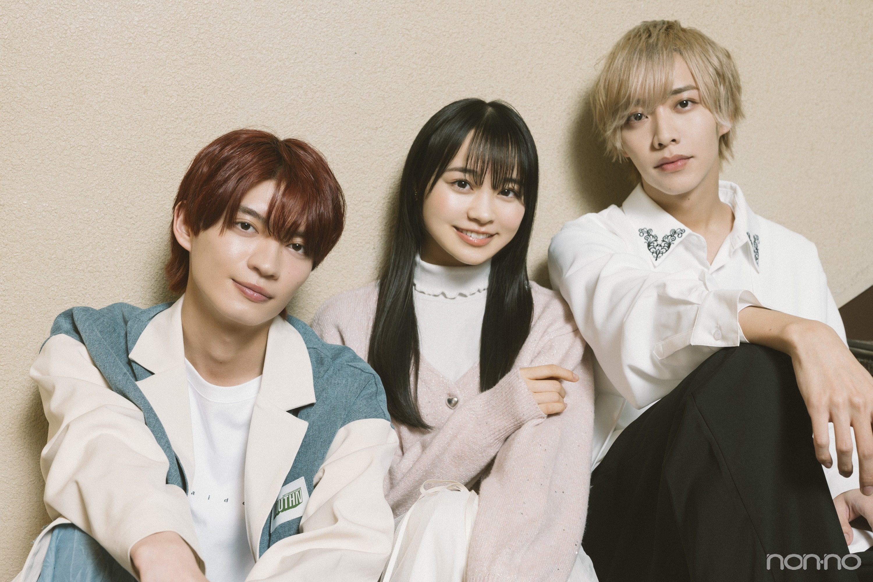 ある日突然、応援していた国民的アイドルが義理の兄に!? 推しがいる人なら一度は憧れたことがあるシチュエーションに毎週ドキドキが止まらないドラマ『熱愛プリンス』が絶賛放送中です。劇中でアイドルグループ・Terzettoのクールで大人カッコいい担当として大人気の梓を演じる杢代和人さん、TerzettoのライバルであるPRISMのメンバー・昴流を演じる松井奏さん、そしてみんなから溺愛されるヒロインの天宮まつりを演じるノンノモデル林芽亜里がそろって登場! キュンキュンがつまった物語の舞台裏は、どんな感じ? 間もなく最終回を迎えるタイミングで3人が最近ときめいた出来事や推しているものについても聞いちゃいました♡