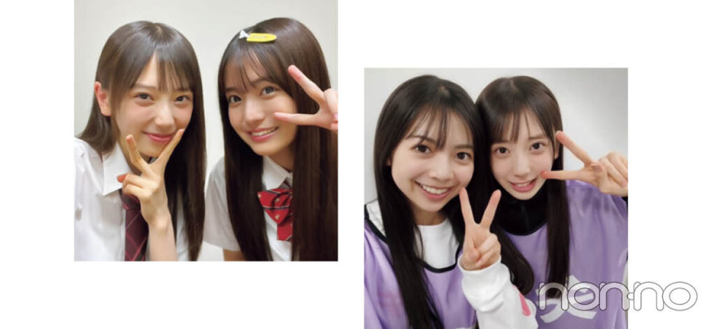 (右)長嶋と初めて憧れのビブスをもらった記念に撮った一枚です。一生懸命練習した後にチョコレートを食べて"口福顔"の二人です♡ (左)オーディション合格後、テスト撮影の休憩時間にみつき(瀬戸口心月)と初自撮りを。同期のなかでも特に緊張していたみつきを和ませたいと思って、メイクルームで自撮りしてみました。