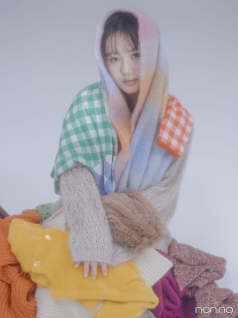 顔に巻いたチェックマフラー¥3850/アンティローザ(idem) ニット¥6600/アダストリア(ヘザー) スカート¥2970/アンティローザ(Birthdayroom) その他/スタイリスト私物