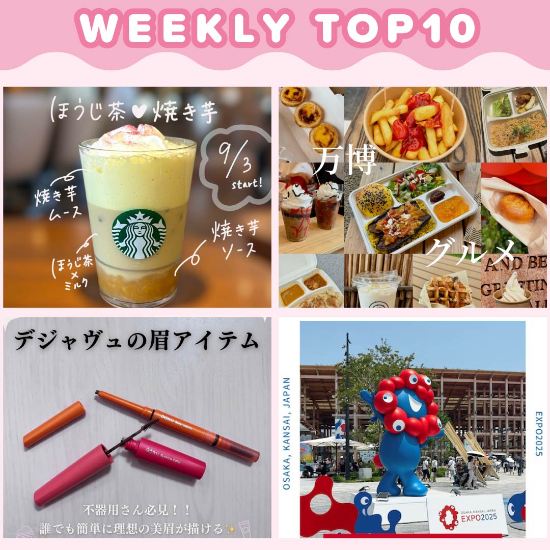 スターバックス ほうじ茶×焼き芋ラテ実食レポ、万博おすすめグルメ10選、デジャヴュの眉メイク商品レビュー…【 大学生エディターズ・WEEKLY TOP10】