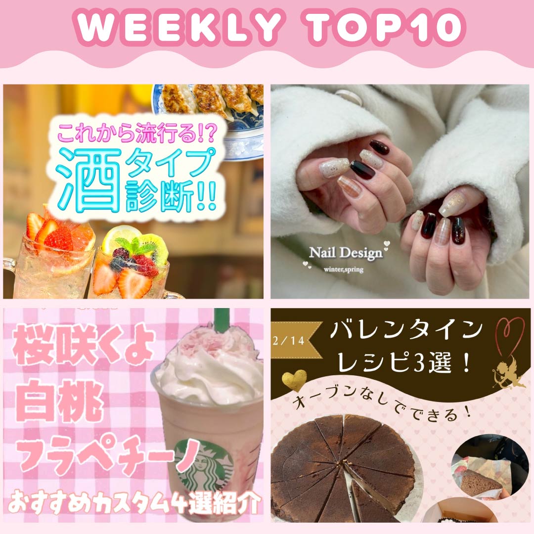 酒タイプ診断、冬から春にかけておすすめネイルデザイン、桜咲くよ 白桃フラペチーノカスタム…【 大学生エディターズ・WEEKLY TOP10】