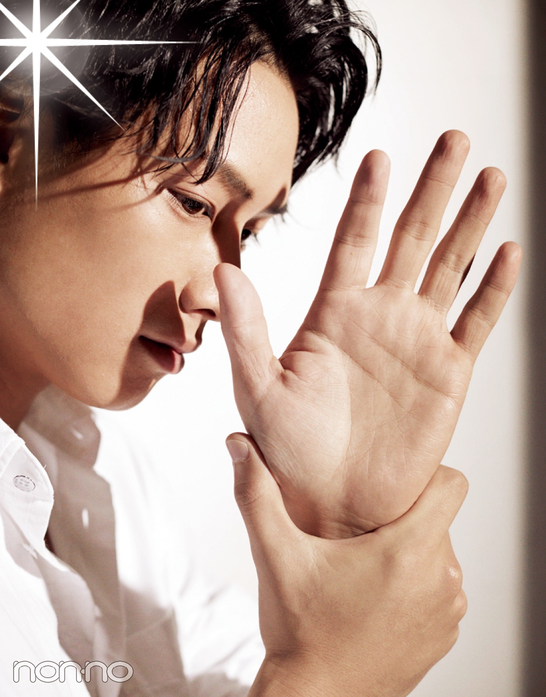 「そんなに自分的に気に入っているってわけじゃないけど、あえてパーツをあげるとすると手かな。他の人の手を注目して見たりすることはないけど、女の人ってよく男の人の手を見るっていいますよね。血管が出てるのがいいとかなんとか。僕の場合はとにかく、なんかサイズが大きいんですよ(笑)。うちの父も身長が183cmくらいあるし、家族みんな手が大きいかも。得したことが特にあるわけでもないなあ……。強いていうなら、スーパーで買い物しすぎた時も、たくさん荷物を持てるぞってことですかね(笑)」