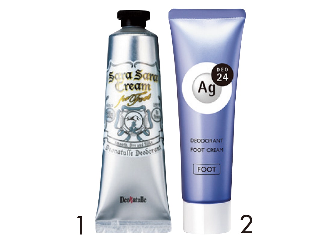 ムレやすい足の指や、角質がたまるかかとは雑菌が繁殖しやすいので、細かい場所までしっかり塗り込めるクリームタイプのデオドラント剤を。