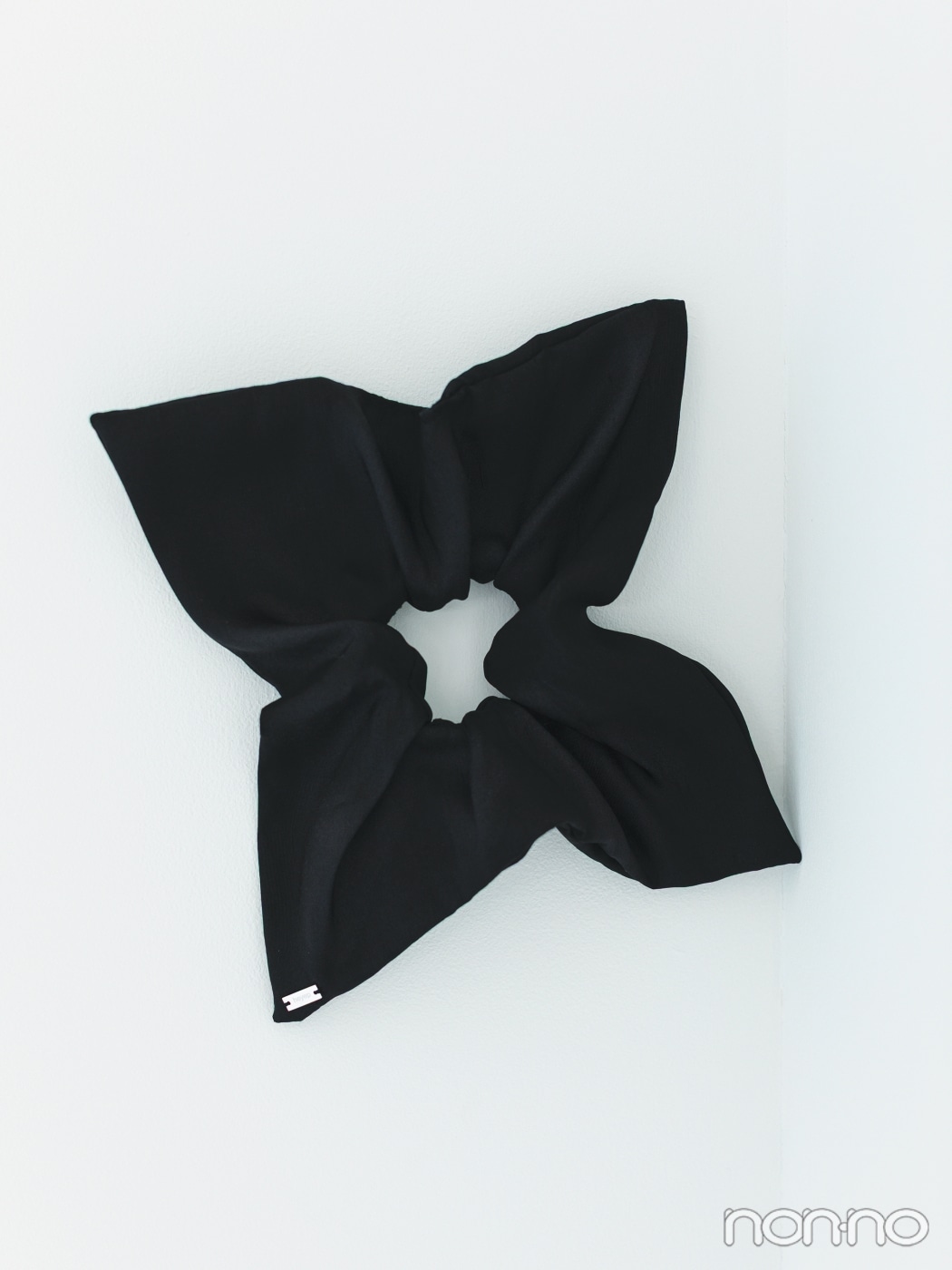リボンのように重なって、結ぶだけで一気におめかし感がアップするスクエア型のシュシュ。オールマイティーなブラックで、特別な日もデイリーなスタイリングの日にも寄り添う。