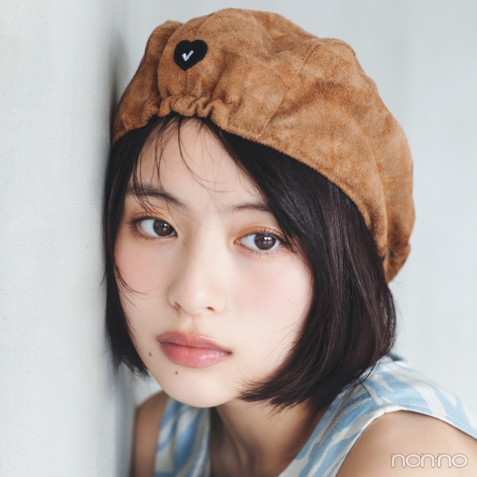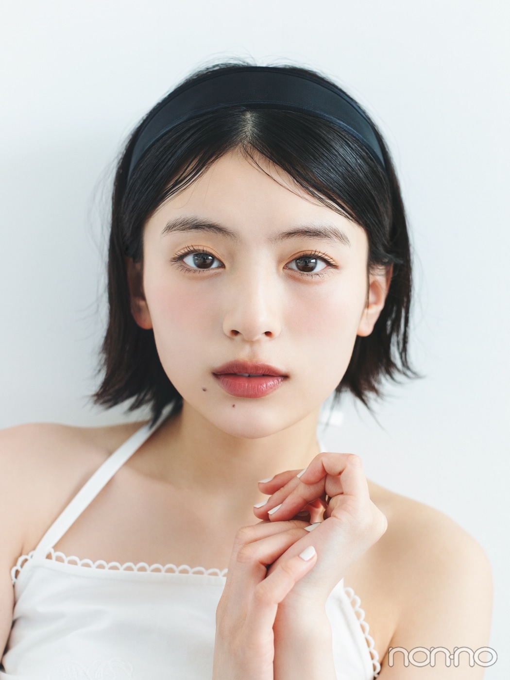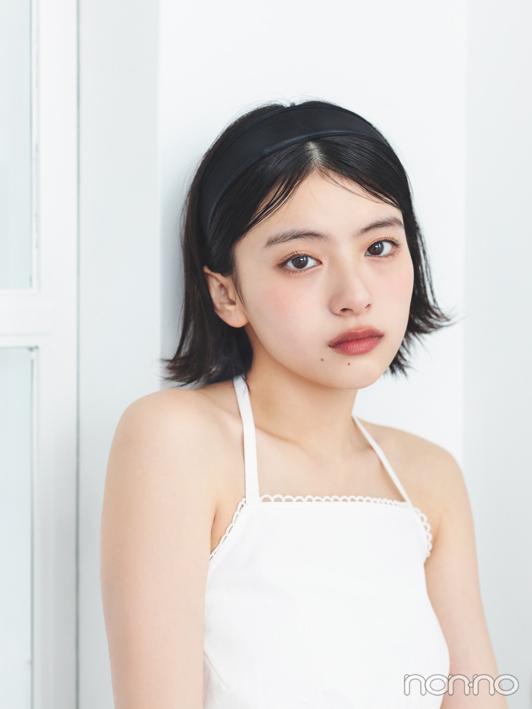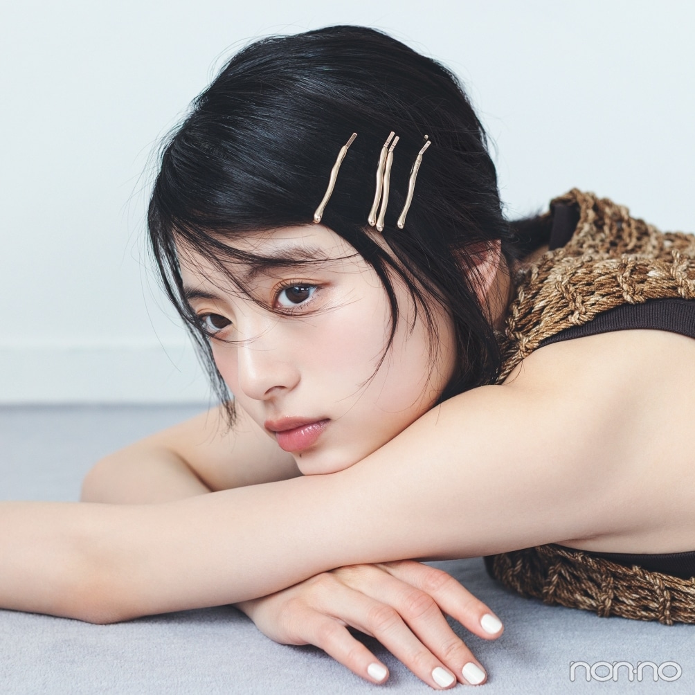 おしゃれ感度の高さをアピールするヘア小物がこの夏大豊作! たくさんのアイテムの中から、最近髪をばっさりカットして可愛さが超絶加速している夏希とともに、 “ボブヘアに似合う”ものをピックアップしてお届け。vol.6は黒髪ボブをドラマティックに味付けする、ブラックのシアーカチューシャをチェック。
