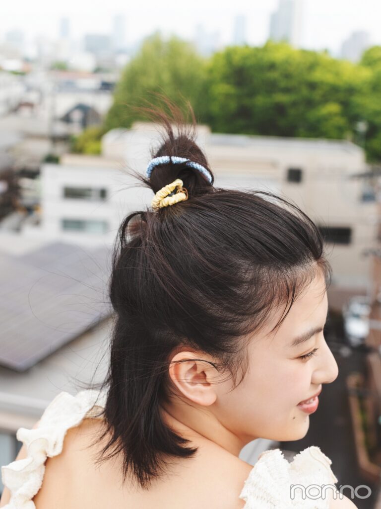 おしゃれ感度の高さをアピールする、ヘア小物がこの夏大豊作! たくさんのアイテムの中から、最近髪をばっさりカットして可愛さが超絶加速している夏希とともに、 “ボブヘアに似合う”ものをピックアップしてお届け。vol.8はざっくり結ぶだけでサマになるカラーゴム。