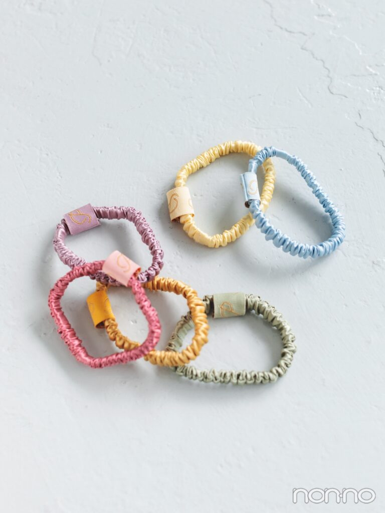くしゅくしゅっとギャザーが寄せられたヘアゴム。適度な太さとくすみカラーの色合いがいいアクセントに。夏希が使ったのは写真右上のイエロー×ブルーだけど、その日のコーデに合わせて好きな色を組み合わせて。