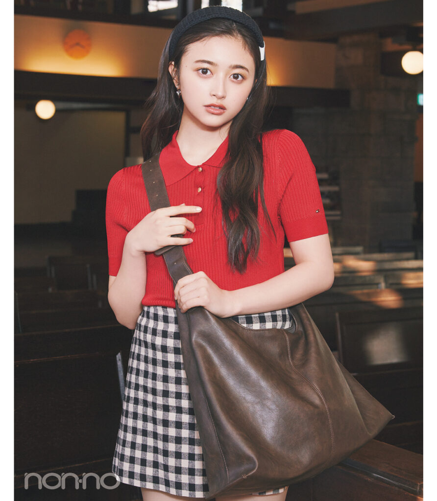 バッグ(30×47×11)(一部店舗のみ販売)¥2990/GU ニット¥25300/トミー ヒルフィガー カスタマーサービス スカート¥7990/Gap カチューシャ¥3850/MERCURYDUO ルミネエスト新宿店(MERCURYDUO×MARY QUANT) イヤリング¥2500/CENE