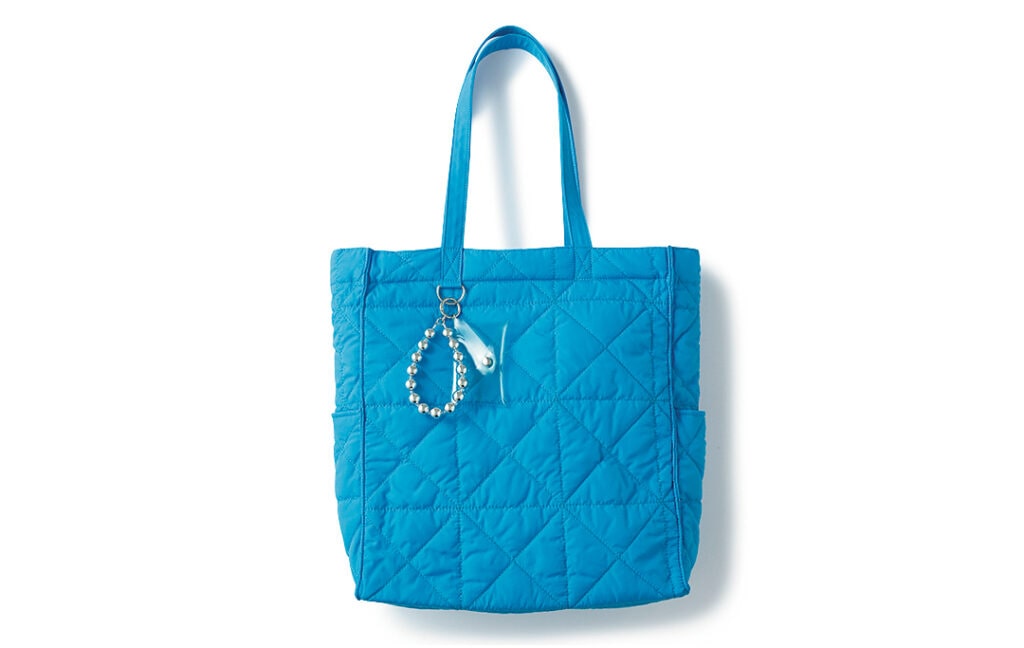 鮮やかなブルーのトートはリップなどの小物を入れられる便利なクリアポーチ&チャームつき。
