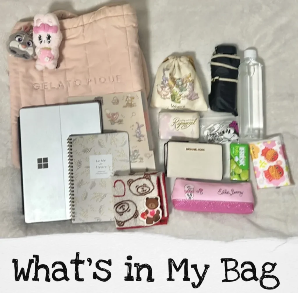 バッグの中身:『Microsoft Surface』シリーズのノートPC、クリアファイル、下敷き、ペンケース、メガネケース、水筒、モバイルバッテリー、ワイヤレスイヤホン、有線イヤホン、財布、コスメポーチ、ハンカチ、手帳、お菓子を入れたポーチ、エコバッグ、カメラ、SDカードリーダー、「シルバニアファミリー」の人形