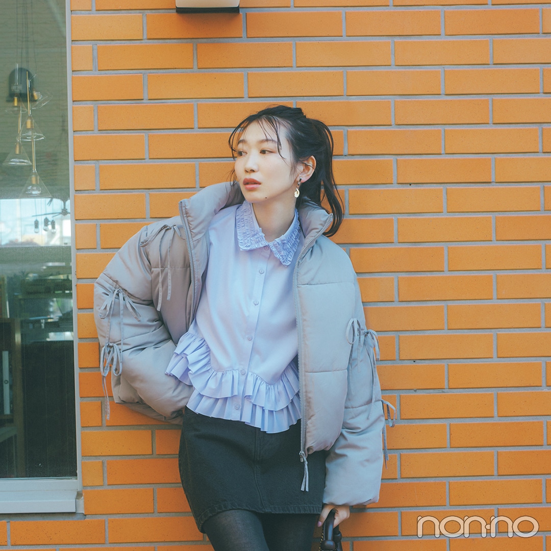 ジャケット¥15950・ジャンパースカート¥14300/Noela カットソー¥4290/リリアン カラット カチューシャ¥2420/ビームス ボーイ 原宿(ビームス ボーイ) イヤリング¥2310/サンポークリエイト(アネモネ) バッグ¥12100・ショルダーストラップ¥3300/アーバンリサーチ ルミネ新宿店(アナベル) 靴¥29700/ダイアナ 銀座本店