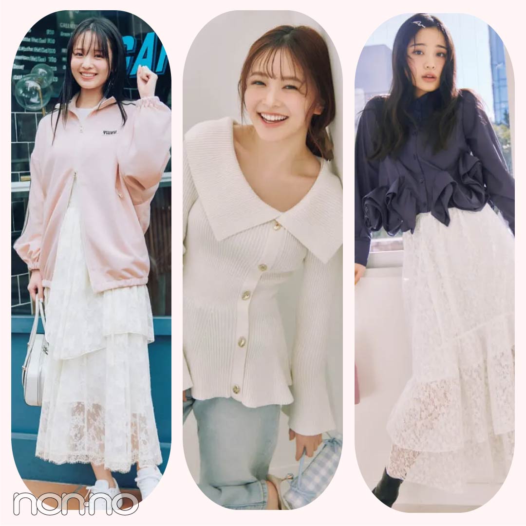 シャツ¥8800/MERCURYDUO ルミネエスト新宿店 ニット¥9790/ココ ディール スカート&ベルトセット¥3289/SPINNS イヤリング¥16500/Jouete リボンタイ¥879/WEGO リング¥22000/ete バッグ¥13900/HANA(スクエアライン)