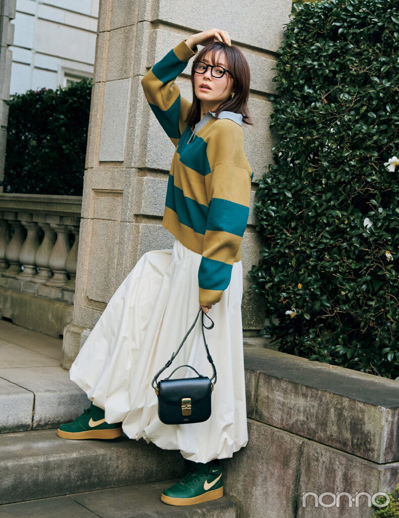 ニット¥3990/UNIQLO スカート¥10989/ナチュラルビューティーベーシック メガネ¥46200/アイヴァン 東京ギャラリー(アイヴァン) イヤリング¥3520/ロードス(yae. BY HACHICO.) リング¥9900/Jouete バッグ¥104500/アー・ペー・セー カスタマーサービス(アー・ペー・セー) 靴¥18150/NIKE カスタマーサービス(ナイキ スポーツウェア) 靴下/スタイリスト私物