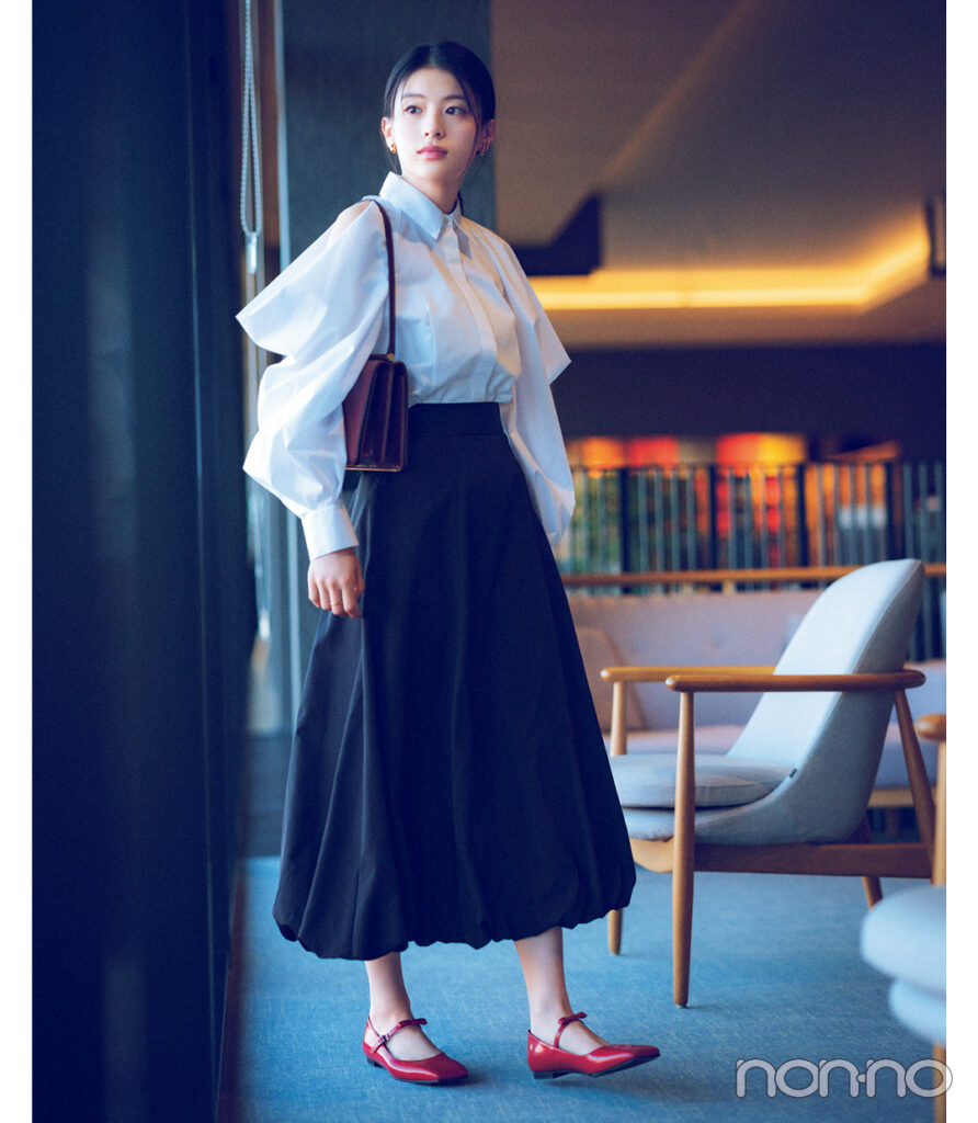 ふんわり甘さがありながらも、ブラック&ロング丈で大人っぽさも両立するバルーンスカートは、この春の注目アイテム。合わせのトップスしだいで印象変化を楽しめるのも魅力。おめかししたいシーンには、キレのあるデザインシャツを投入し、モードにまとめるのがベター。