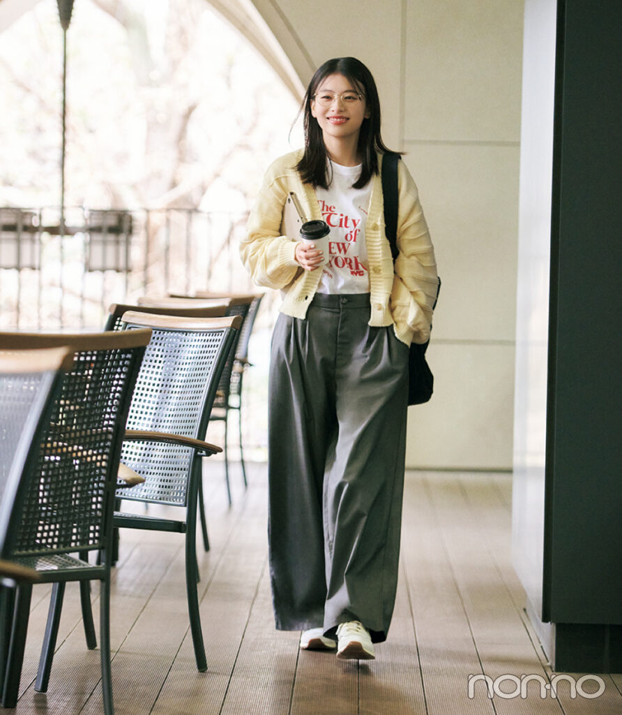 力の抜けたカジュアルスタイルは、イエローカーデからのぞくTシャツの赤ロゴがおちゃめなアクセント。