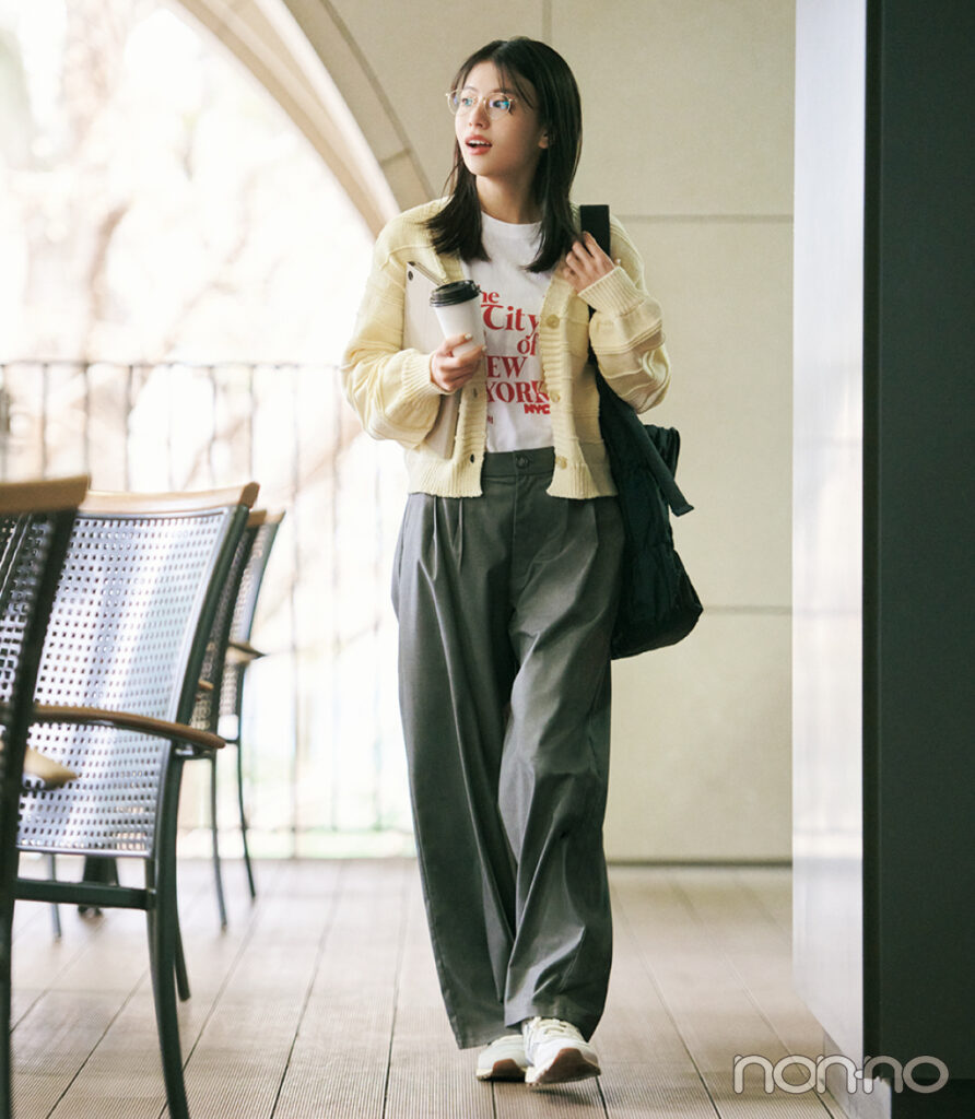 カーディガン¥6490/ROPÉ PICNIC Tシャツ¥6360/フリークス ストア渋谷(フリークス ストア) パンツ¥10450/ACLENT メガネ¥41800/アイヴァン 東京ギャラリー(アイヴァン) バッグ¥5940/ユナイテッドアローズ カスタマーサービスデスク(CITEN) 靴¥15400/ニューバランスジャパンお客様相談室(New Balance)
