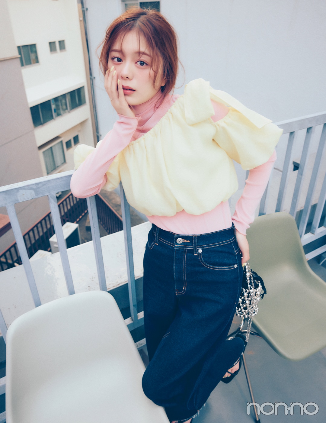 個性を出したい日にぴったりのパステルレイヤード。イエローとピンクを重ねるだけでたちまちおしゃれ上手な印象に。子どもっぽくならないよう、インディゴデニムでキリッと印象を引き締めつつトップスの配色を引き立てて。