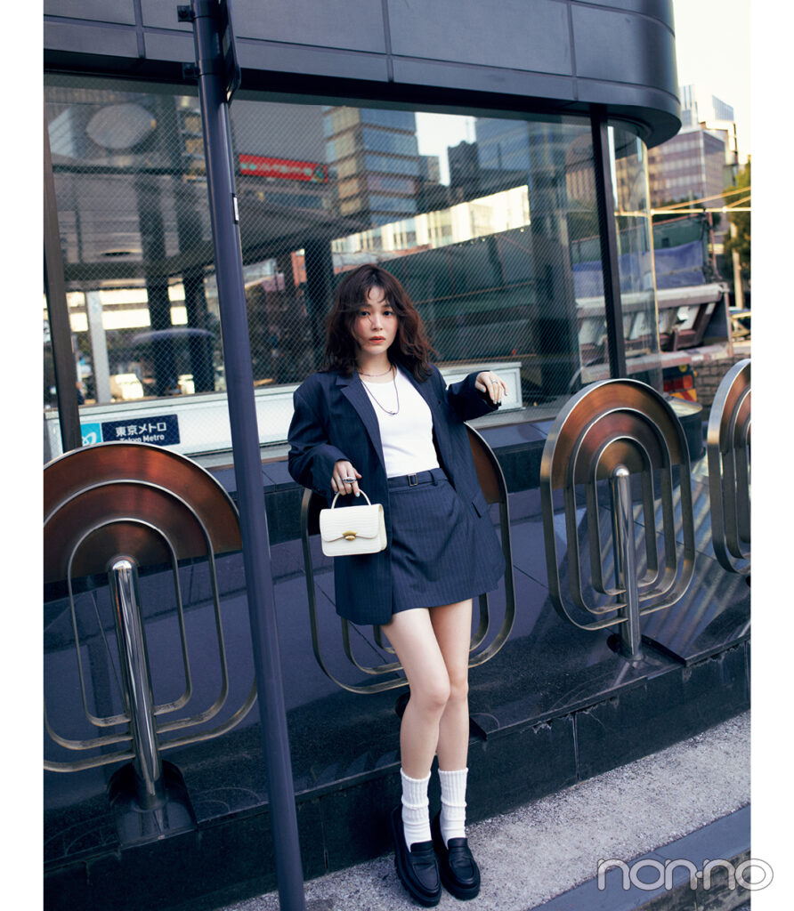 端正なジャケット×女の子らしいミニスカは、セットアップを選ぶことで着こなしが簡単になるし、こなれ感も満点。「まさに"今の私"らしいスタイル!」(りんくま・以下同)。白のソックスで仕上げに甘さをもうひとさじ。