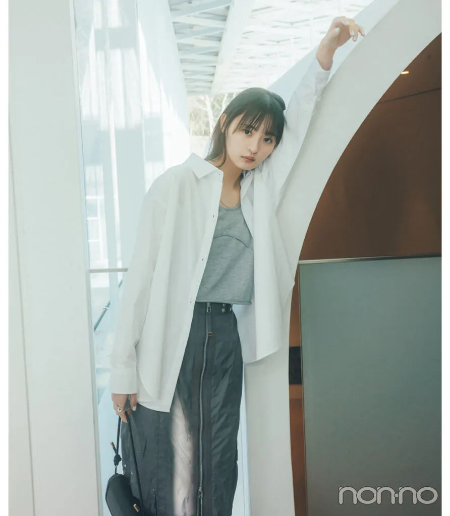 GW前の登校日は、ビスチェ×ワークスカートのトレンドアイテム盛りコーデで出発。落ち着いた色味のスタイリングでも地味見えしないのは、ビスチェとワークスカートのデザイン性が高いからこそ。シンプルな白シャツが主張のあるアイテム同士のつなぎ役に◎ スリットからのぞく素肌はハイソックスで中和させて。