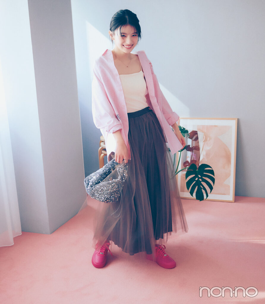 ニュアンスのあるブラウンと淡いピンクが相性抜群。スウィートなチュールスカートは、ラフにはおるシャツとビビッドなピンクのスニーカーで着崩し、鮮度を高めて。中に白のキャミを入れれば、爽やかなヘルシーさもUP。