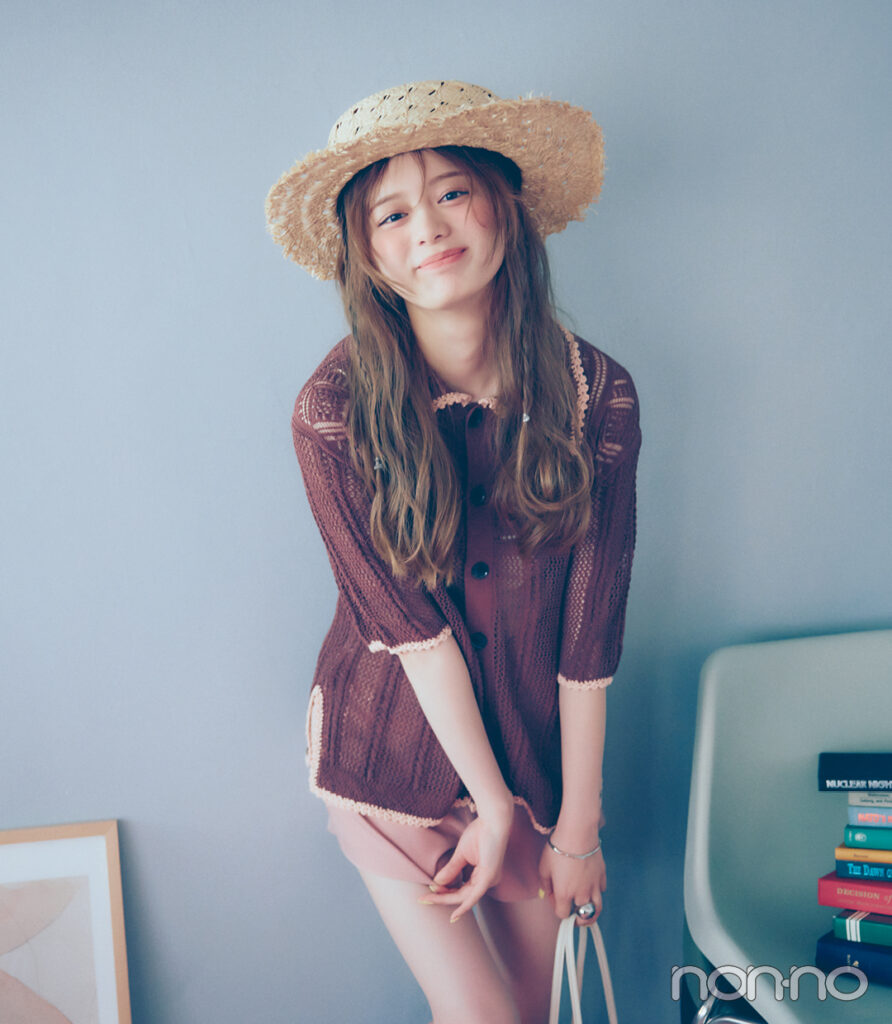 ピンクのトリミングがポイントの透かし編みニットに、同色のショートパンツを組み合わせることで、まとまりのある着こなしが簡単に完成。初夏ムードを感じさせる快活さがありながらも、落ち着いたブラウンのおかげで、余裕のある大人な表情に。