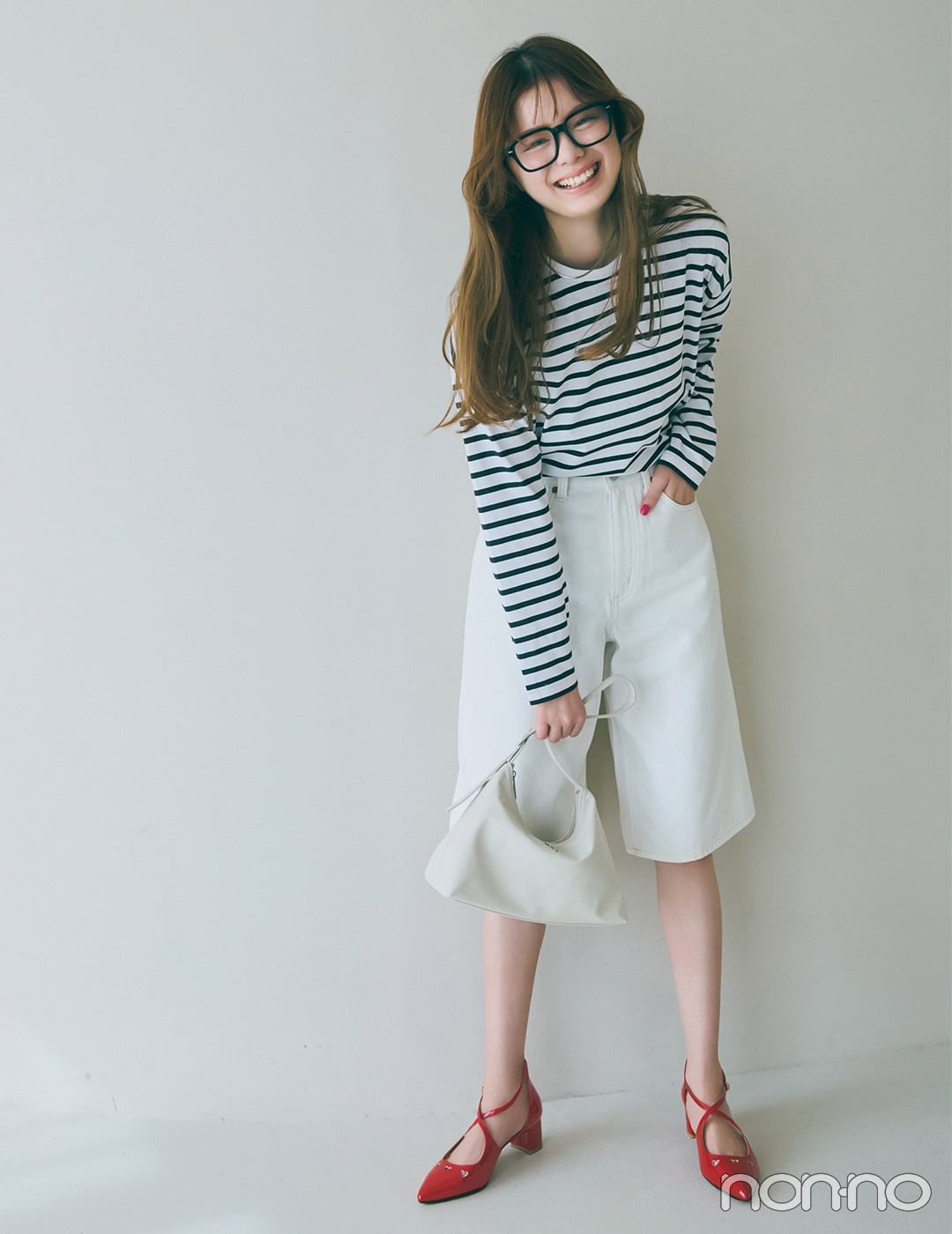 カジュアルなボーダートップスこそ、女らしさたっぷりな赤いポインテッドトウパンプスを合わせて、“さりげないのに印象的”を目指して。どこかフレンチシックなムードもあって、今っぽさも満点♡