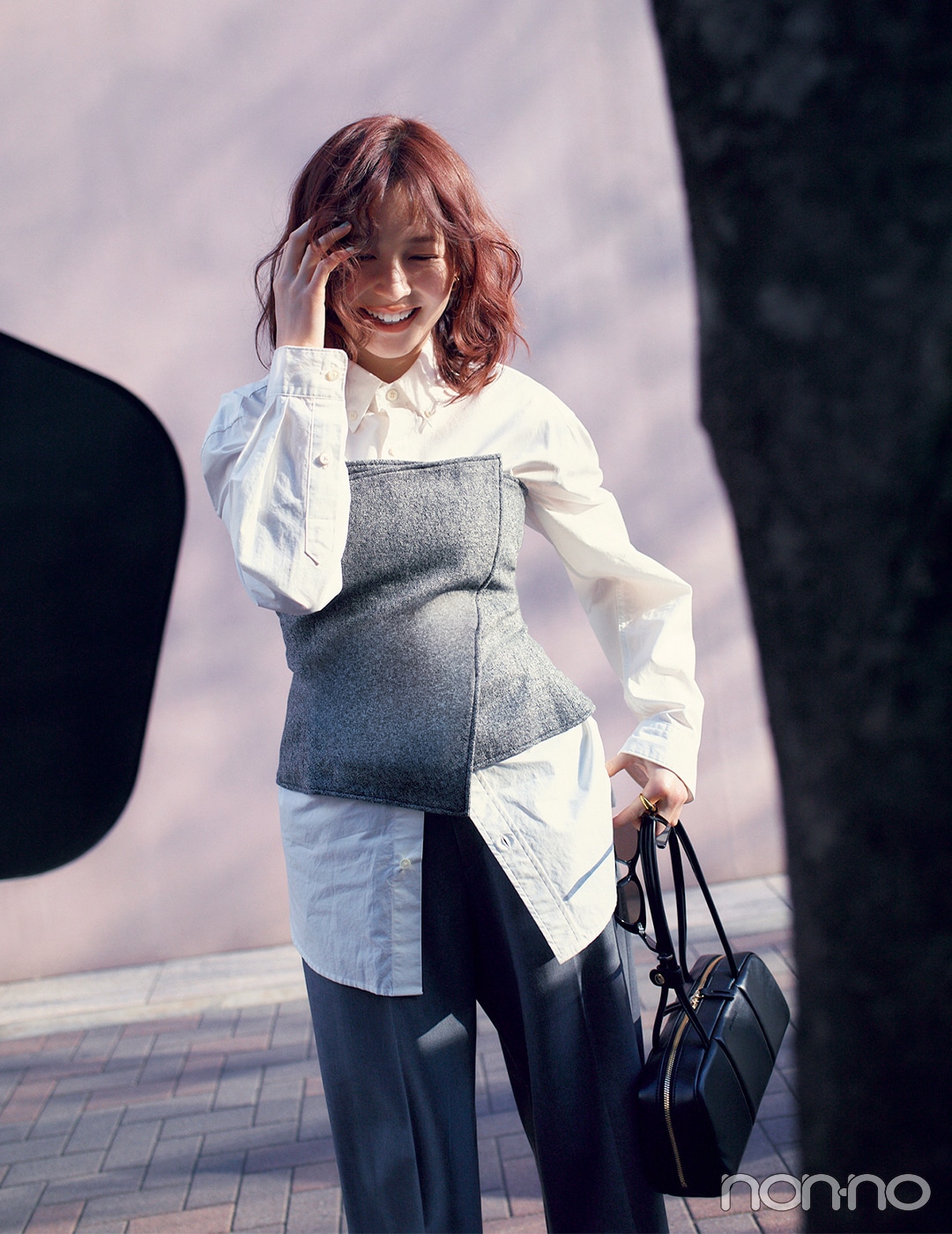 ベーシックな白シャツはそのままでももちろん素敵だけど、今季らしいエッセンスを注入するならビスチェとのレイヤードで。さらっと一枚で着るよりトレンド感もこなれ感もぐんとアップ。