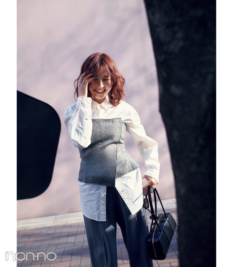 トレンドのビスチェを重ねて大人な白シャツに可愛げを
