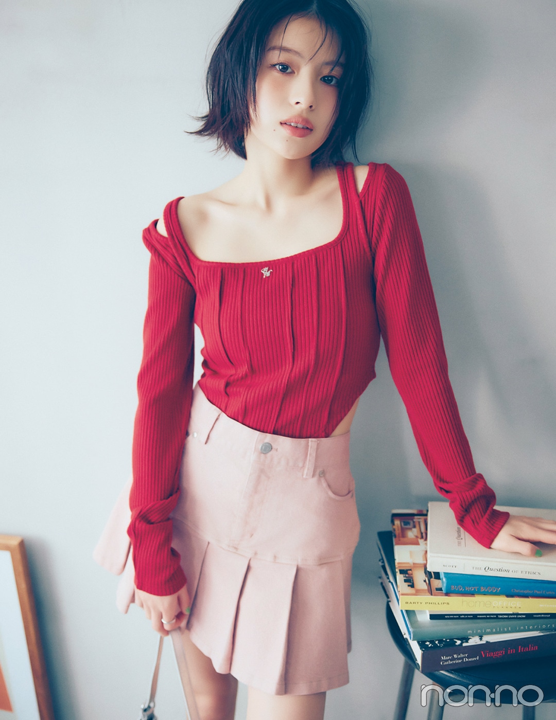 肩&両サイドがカットアウトされた赤の肌見せトップスは、一枚で絵になる主役級の存在感。かといって無難なボトムに逃げることなく、ピンクのプリーツミニで新しい着こなしを開拓!