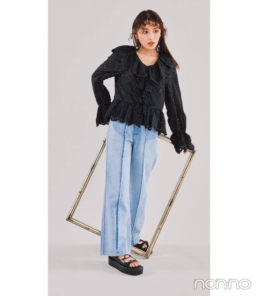 ブラウス¥20900/アプワイザー・リッシェ パンツ¥24200/ヤマツゥ(イチゴーナナウォードブルー) イヤリング¥3850/サンポークリエイト(mimi33) 靴¥13900/CHARLES & KEITH JAPAN