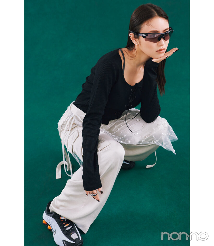 サングラス¥38500/ルックスオティカジャパン カスタマーサービス(オークリー) トップス¥3850/SPINNS スカート¥3960/Lumier パンツ¥16500/ユー バイ スピック&スパン ルミネ池袋店(ユー バイ スピック&スパン) イヤカフ¥2420(TIGRIS)・リング¥3520(ヘンカ)/ロードス 靴¥21230/NIKE カスタマーサービス(ナイキ スポーツウェア)