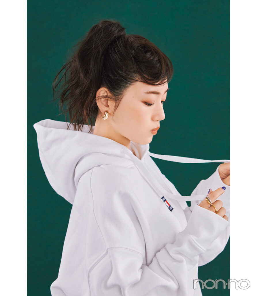 通学服の定番・フーディは、フードが大きく、くたっとしない生地を選ぶのがマスト。アゴ回りにボリュームが出るから、ヘアはアップにしてスッキリと!