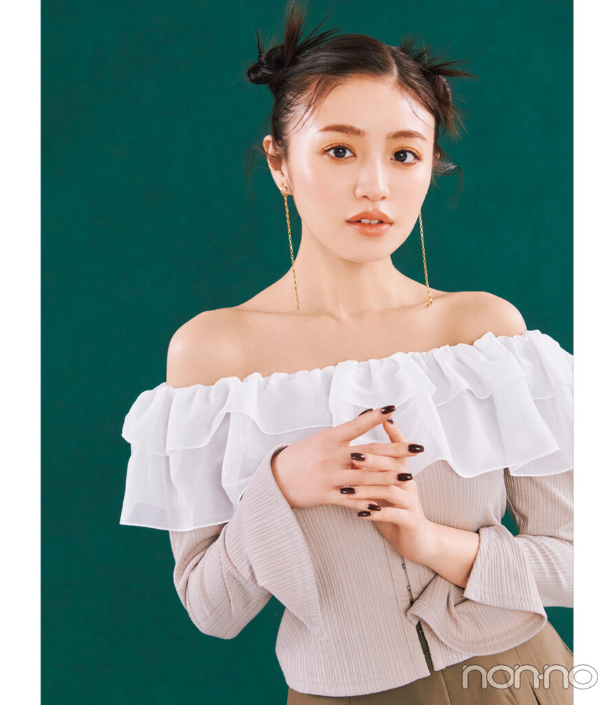 デコラティブなフリルオフショルは、肩やデコルテの美しさを強調してくれるのはもちろん、首元を大胆に出すデザインで小顔効果抜群。さらに、袖が肩から落ちているので気になる二の腕も目くらましすることができるという優れもの。