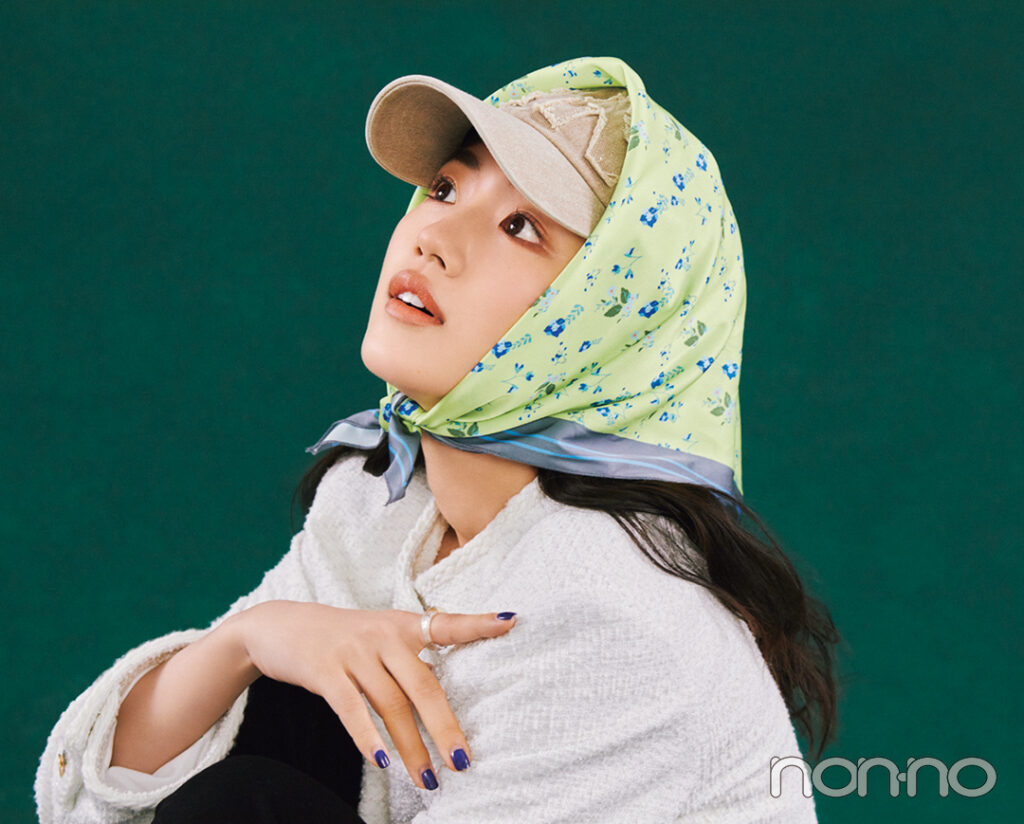 つばが長くて、横幅もしっかりあるキャップは、影を作って、顔の面積を小さく見せてくれる。気になる頬の横は、トレンドのスカーフを巻いてカバー。