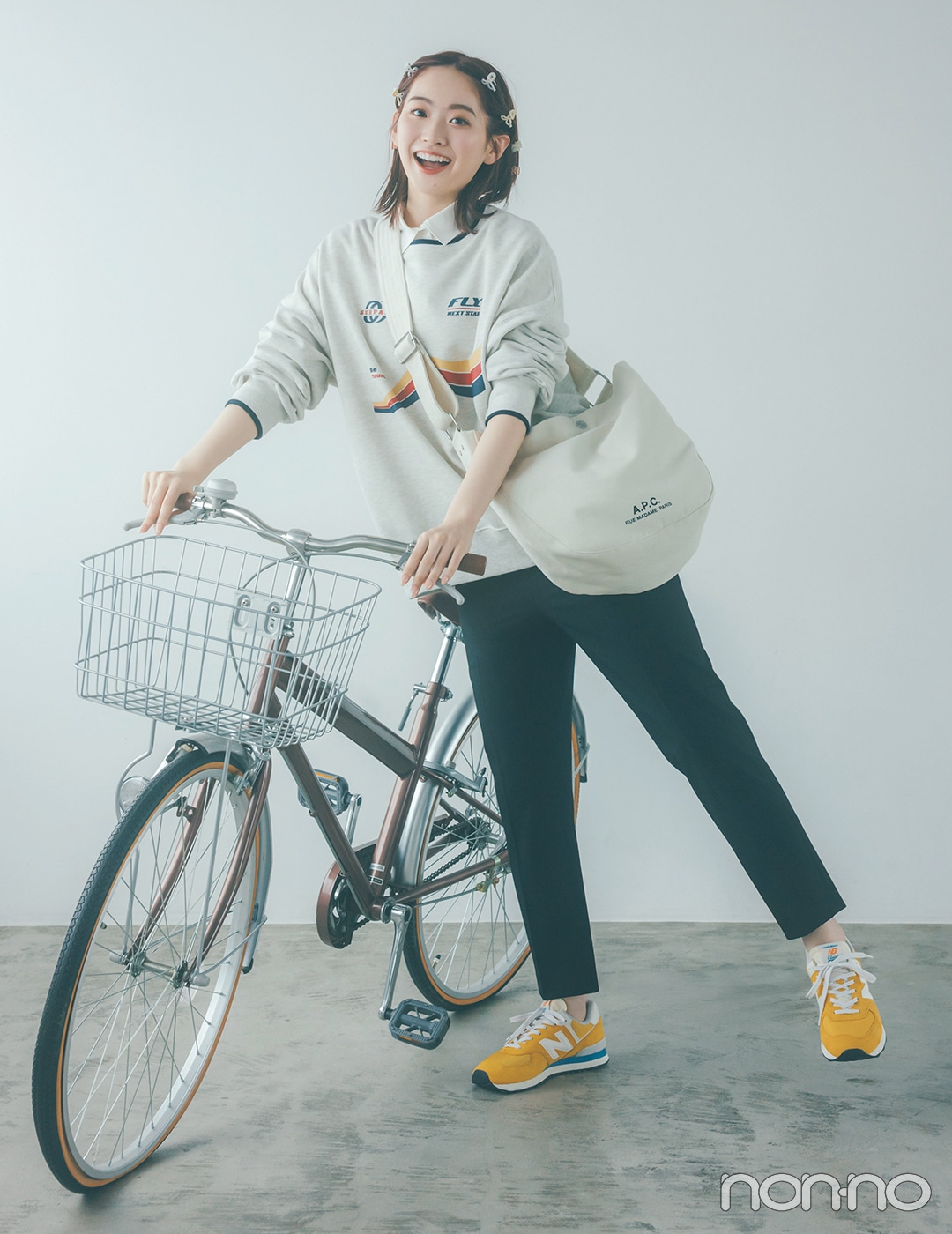 スウェット¥4950/アンティローザ(Birthdayroom) インに着たシャツ¥17600/アプワイザー・リッシェ パンツ¥3990/UNIQLO ヘアクリップ(8個セット)¥590/GU バッグ¥35200/アー・ぺー・セー カスタマーサービス 靴¥13970/ニューバランスジャパンお客様相談室