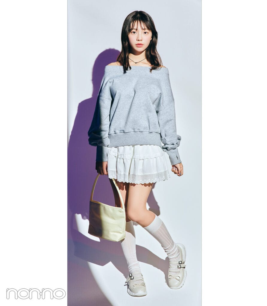 靴(5)¥4950/SPINNS スウェット¥9350/ココ ディール スカート¥2970/アンティローザ(Birthdayroom) ネックレス¥550/WEGO バッグ¥8150/HANA(ムクアンドエボニー) 靴下¥1760/Tabio(靴下屋)
